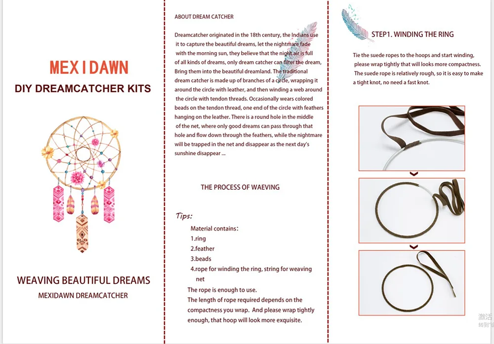 Material: Ring,Feather,Beads,Rope for winding the ring, String for weaving net.