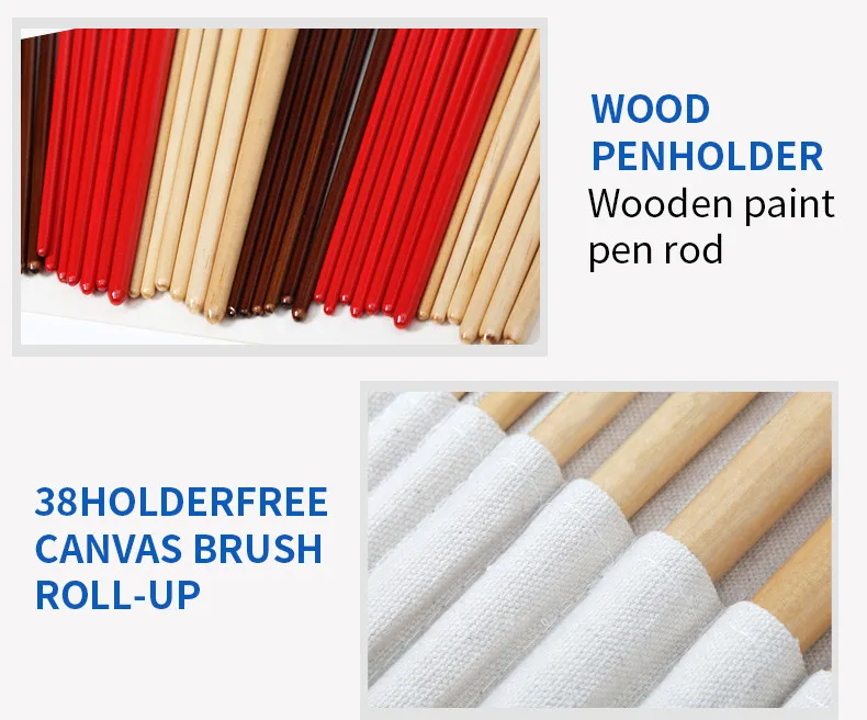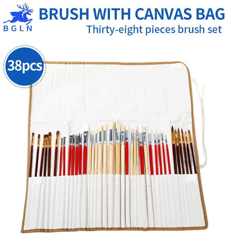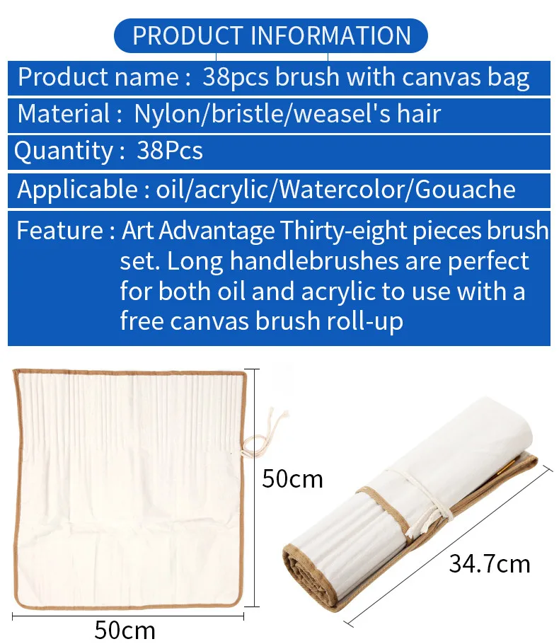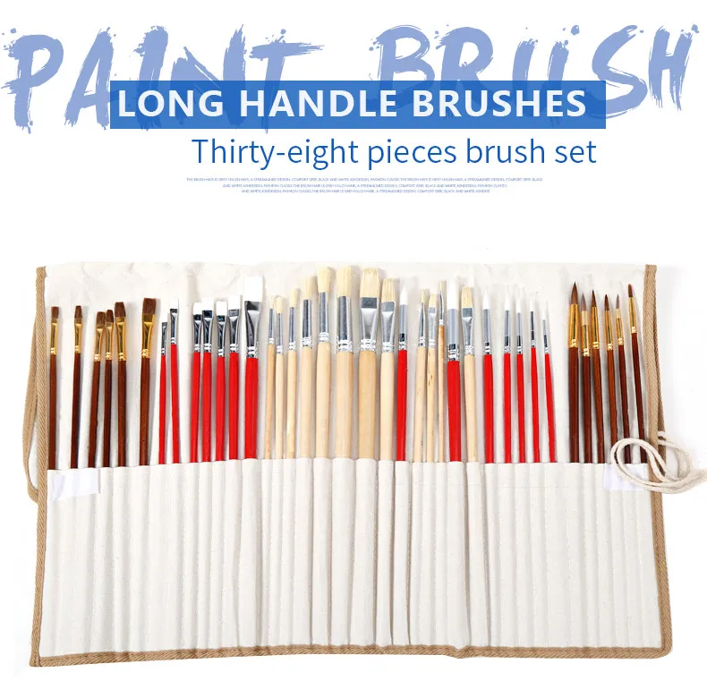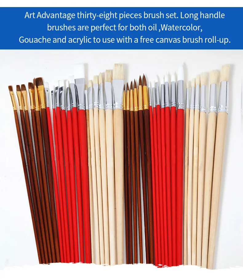 2.Art Advantage thirty-eight pieces brush set. Long handle brushes are perfect for all oil , acrylic ,watercolor ,gouache to use with a free canvas brush roll-up.