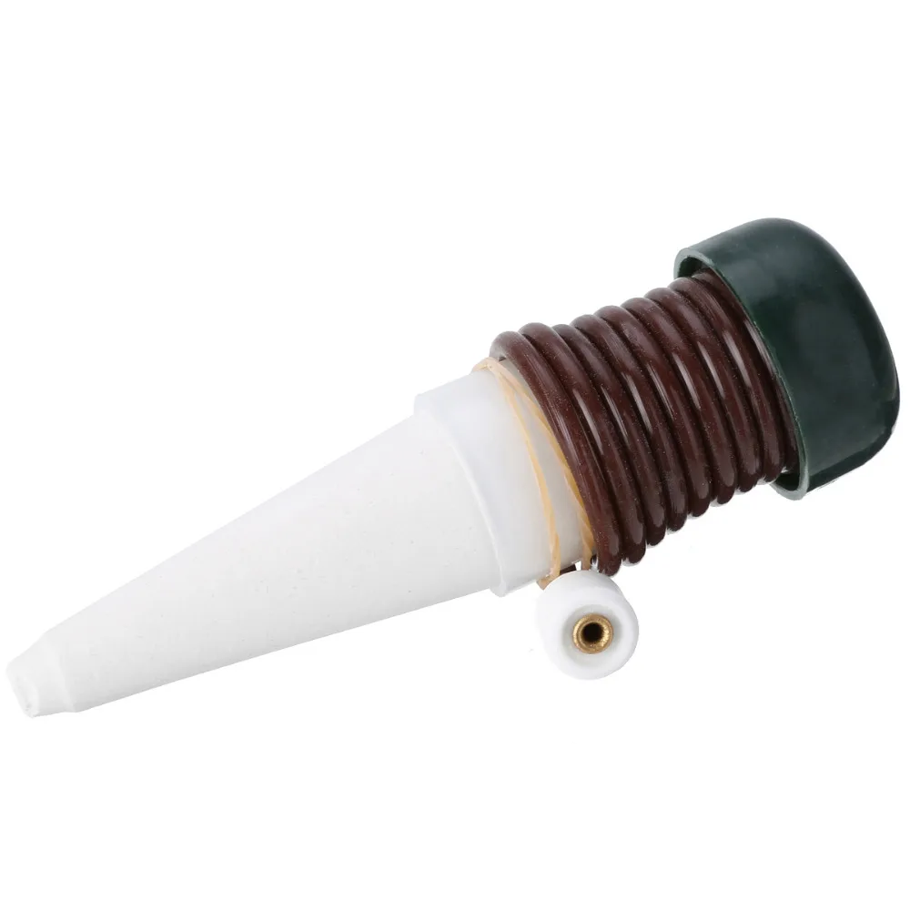 Jeden koniec plastikowej rurki do pojemnika na wodę, a biała porcelanowa część głowicy jest całkowicie włożona do gleby