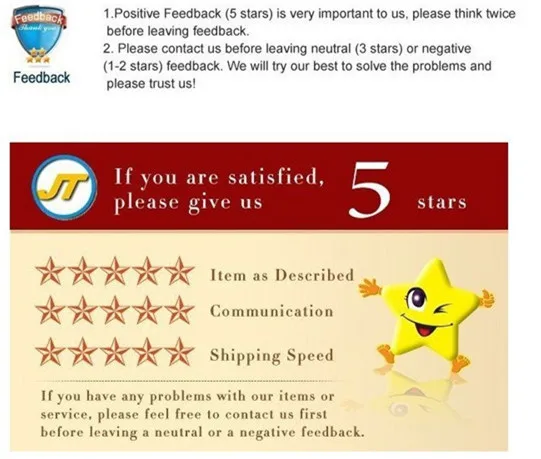 We maintain high standards of excellence and strive for 100% customer satisfaction! Feedback is very important We request that you contact us immediately BEFORE you give us neutral or negative feedback, so that we can satisfactorily address your concerns.