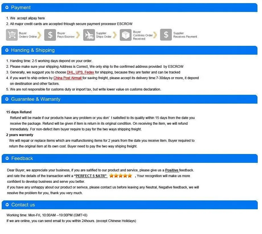 - If you are not satisfied with our product or not arrive in time , please contract us first ,we will solve the problem for you,please don\'t open the dispute directly. thank you.